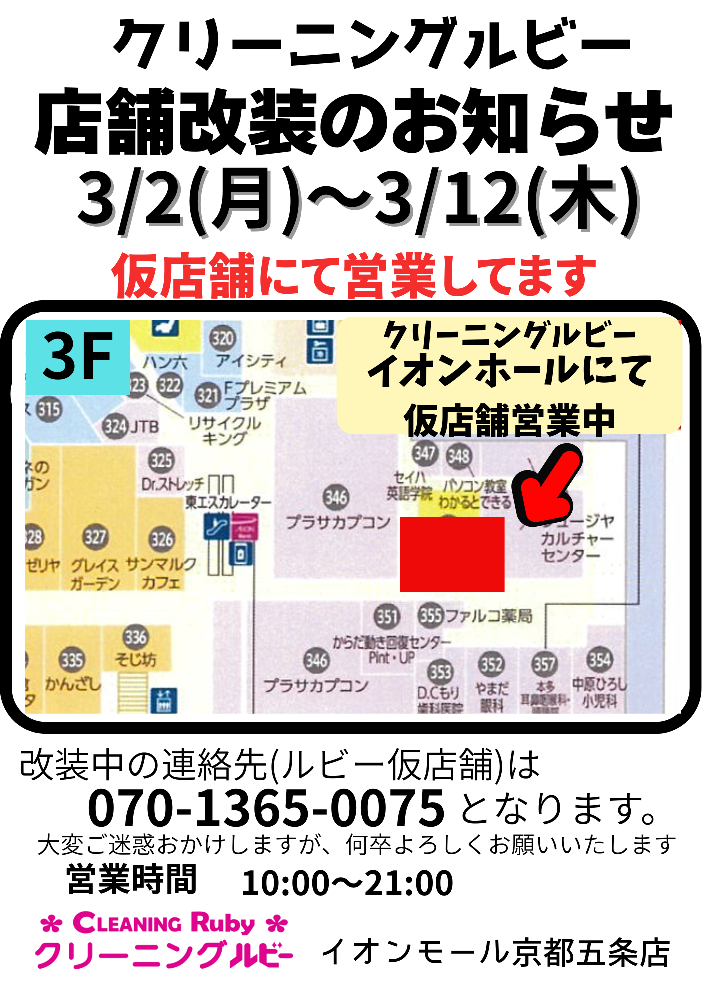 改装期間中の店舗へのお問い合わせ【TEL 070-1365-0075】